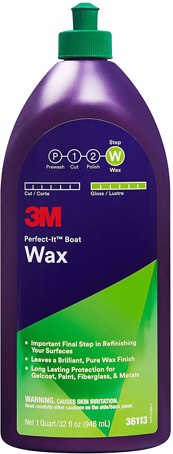 An excellent final step for any process where wax finish is recommended Contains pure carnauba wax for a brilliant, pure wax finish Protects gelcoat, paint, fiberglass and metals from the elements Liquid wax formula is easy to apply and clean up Part of a complete range of Perfect-It™ products for gelcoat finishing Our 3M™ Perfect-It™ Boat Wax is the final, brilliant step in achieving a truly professional marine finish. Its blend of pure Brazilian carnauba wax, silicones, polymers and resins brings out an extraordinary gloss and provides durability against the elements. The liquid wax formula is easy to apply and remove even on warm surfaces, and is safe for gelcoat, paint, fiberglass and metal. 3M™ Perfect-It™ Boat Wax, 36112, Pint (473 mL) The pure wax finish protects against the elementsA Brilliant Marine Finish, Fast For a truly professional finish to marine and other gelcoat surfaces, our 3M™ Perfect-It™ Boat Wax is a brilliant final step — its formula contains pure Brazilian carnauba wax, renowned for its hardness and show-quality finish. This premium wax delivers a smooth, extremely high gloss finish, and forms a durable shell that helps protect the surface against weathering. Though ideal for gelcoat, it is safe for use on paint, fiberglass and metals. This liquid wax wipes off cleanly and easily, and is very simple to use in all climates. Part of a Complete Range of Products for Gelcoat Cutting, Polishing, Washing and Waxing For professionals and owners, the 3M™ Perfect-It™ Gelcoat Finishing products works great on boats, RVs and industrial gelcoat surfaces — new and used alike. These products include a step-by-step process to help you achieve dependable finishes every time, regardless of one-, two- or three-step processes. And the color-coded bottles allow for easy reference in the shop or on the dock. The full series of 3M products created specifically for gelcoat includes 3M™ Perfect-It™ Boat Wash, 3M™ Perfect-It™ Heavy Cutting Compound, 3M™ Perfect-It™ Medium Cutting Compound + Wax and 3M™ Perfect-It™ Light Cutting Polish + Wax. This range of products is ideal for achieving professional-grade gelcoat finishes for boats, RVs and industrial applications.