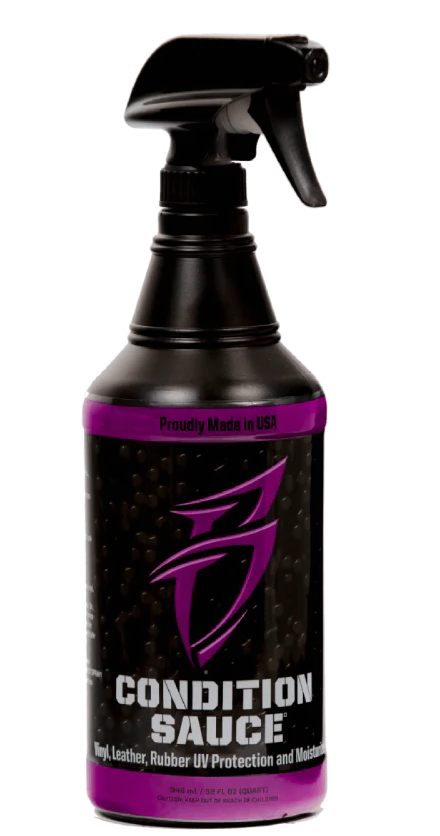 You wouldn’t think of sitting in the sun all day without protective clothing or sunblock. Protect your investment. Unlike generic surface dressings that leave greasy, slippery residue, Condition Sauce is a functional UV protectant designed to block the sun’s harmful rays, prevent fading, cracking and discoloration from vinyl, leather, rubber and plastic while moisturizing the material to provide the stunning ‘like new’ look.