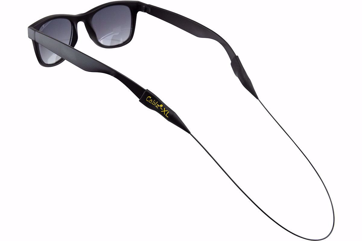 NON-ADJUSTABLE black coated stainless cable Our standard “universal” size temple end is very “stretchy” and should fit most frames.