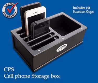 Tired of cell phones all over the boat? We have your covered. CPS has five cell phone slots, also fits phones with most waterproof cases. Has a storage box for any other loose items, sunscreen, keys. wallets. etc. Overall dimensions; 9 3/4" x 5 1/2" x 3" Box Dimensions 4" x 4 1/4" x 3" deep Made out of Starboard, won't warp or fade from the sun. Can permanently be mounted or mounted with suction cups (included) Lifetime warranty, Made in America, Tested on the water.
