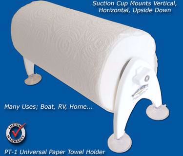 Use this handy paper towel holder in the boat, RV, home, etc. Suction cup mounts in any position on any smooth surface.