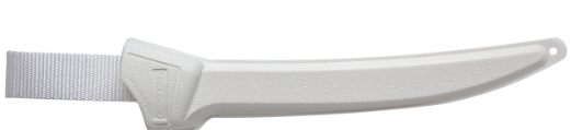 Keep your knife protected and accessible with our secure and durable scabbard. This white molded polypropylene scabbard is the perfect fit for SOFGRIP and SANI-SAFE series of fillet knives (from 6” to 9” in length), and Tiger Edge 8” scalloped knives. This scabbard features a riveted strap integral belt loop for safe transport. Our white knife scabbard does not hold curved knives. (#20450)