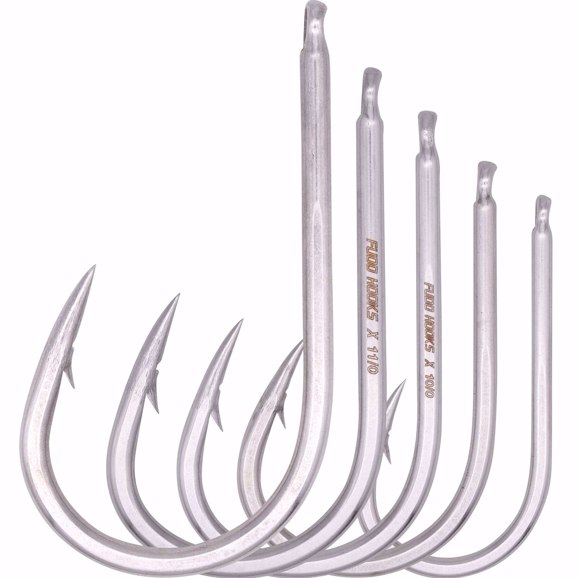 FUDO Super Ocean Tuna Needle Eye Hooks are true “J Hooks” that provide more open throat and grasp than that of the Southern Tuna style. These are versatile hooks that provide great performance when trolling or fishing bait for large gamefish. This is the preferred hook style for anglers chasing striped marlin in Southern California and Mexico as it’s believed that the ‘open’ nature of the throat and knife edge point produce more consistent hookups than that of more closed hooks. Recently, anglers have been seeing excellent results on swordfish after switching to this style of hook from a more closed throat. The construction of this classic hook starts with premium Japanese stainless steel. Each hook is hand formed and sharpened by skilled craftsmen in Japan to ensure quality and fishability out of the box. The needle eye is the preferred hook connection point for building stainless steel cable hook rigs, creating a smooth transition and less bulk than ringed hooks. The eyes are formed with a punch and painstakingly deburred one at a time to eliminate rough edges that might otherwise fray cable or mono/fluorocarbon leader. These hooks carry the Super Ocean designation, indicating they are built extra strong and will not fail when the fish of a lifetime is pulling its hardest. To achieve this strength, each hook is composed of premium Japanese stainless steel, using the wire of the larger size hook. Once the hook is formed, a proprietary heating treatment is applied. Lastly, these hooks are put through passivation treatment to ensure additional corrosion resistance to ensure greater longevity when exposed to harsh maritime conditions.