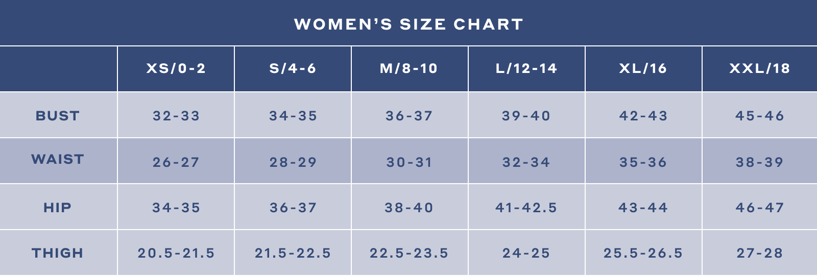 All measurements are in inches unless otherwise noted. Measurements refer to body size, not garment dimensions.