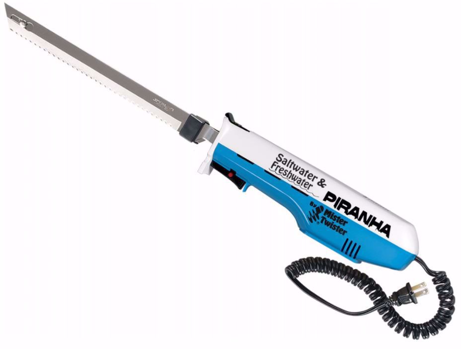 Saltwater and trophy freshwater fishermen have a fillet knife that can handle any big fish in the Piranha™ from Mister Twister®, the pioneer in electric fish cleaning technology. Every bit as rugged as the classic Mister Twister® Electric Fisherman™, the Piranha™, features 25% more torque and 15% more speed than most other electric knives, so it will handle the tough scales and skin of any trophy fish. The real key to its cutting power is in its 9" heavy duty stainless steel blade. More power, more torque, and more speed make the Piranha™, "Bad to the Bone!"