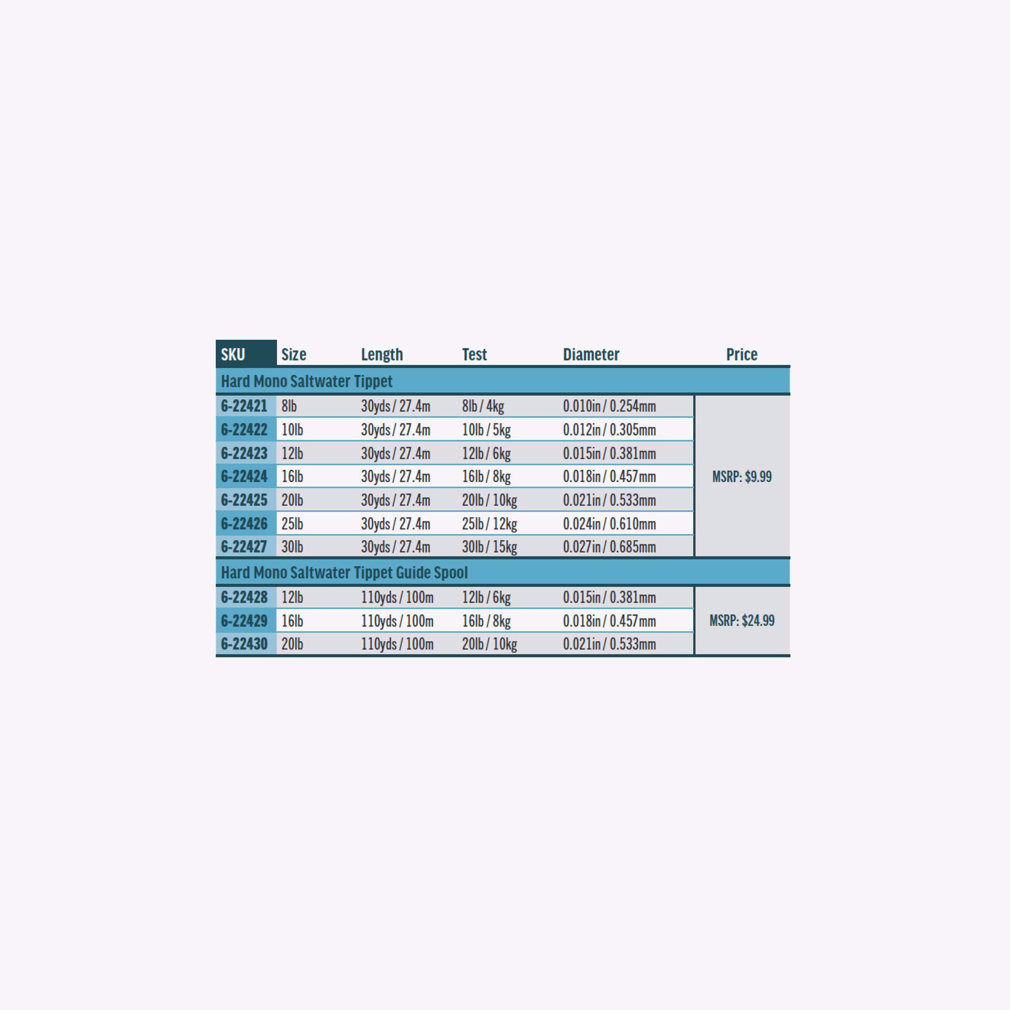 RIO's Hard Mono Saltwater tippet is a very stiff, super abrasion-resistant nylon tippet material. Ideal for casting the largest flies and in tough winds to get the very best turnover. It is available in regular sized spools and guide spools":