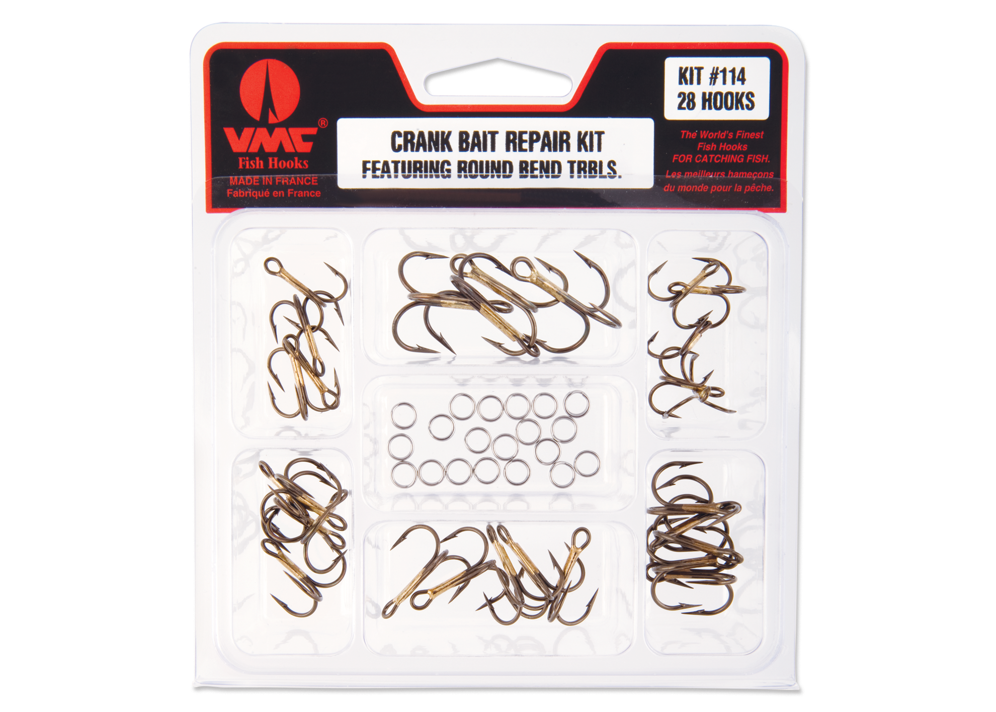 This is VMC® ultimate Crankbait Repair Fishing Kit with all the round bend treble hooks and split rings you'll need to rehook your favorite lures. Includes 28 pieces of 1X strong round bend regular & short shank treble hooks & 20 split rings