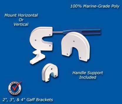 Have kids? Pets? or just need a safe place to store your gaff? The GP series Gaff Brackets are designed to keep the hook covered and shaft supported and fits most every gaff we tried it on. Simple one hand in-out for quick removal by releasing the elastic strap on the shaft support. Fits hook sizes of 2, 3, & 4 inch and shaft sizes up to 1" in dia. Constructed of 100% marine-grade polymer. Lifetime manufacture warranty.