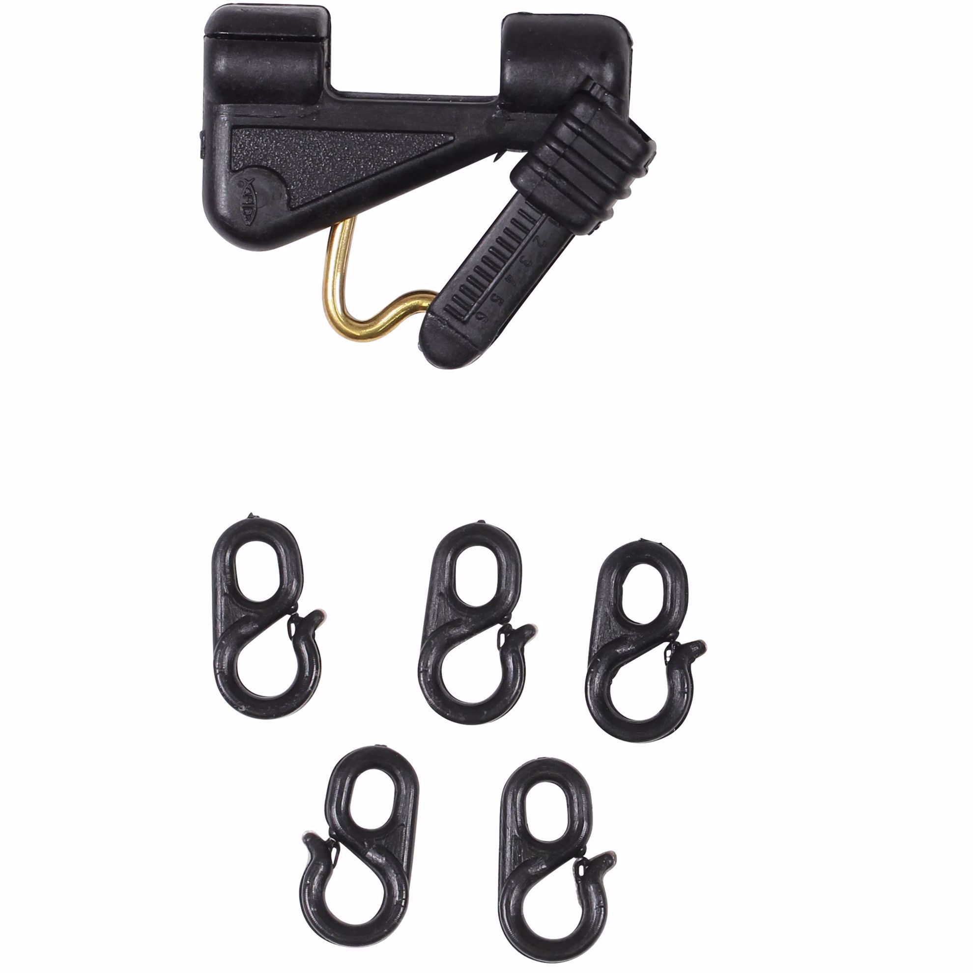 The Goldfinger Kite release clip is essentially the same clip as the Downrigger Clip,but has a gold titanium-nitride coated bail. Packaged with 5 Kite Hooks,the Kite Clip is designed for single or multiple clip use on kite fly-lines. For single use,this clip can simply be threaded on the fly-line. For multiple use,the clips slider-holes may be drilled out to allow swivels up to a #5 size to pass through (see Kite instructions). The enclosed nonabrasive kite hooks should be hooked on the fishing line,and the clip's bail should be passed through the hole opposite the hook. This allows the fishing line to be positioned properly in the Kite Clip once the bait is deployed.
