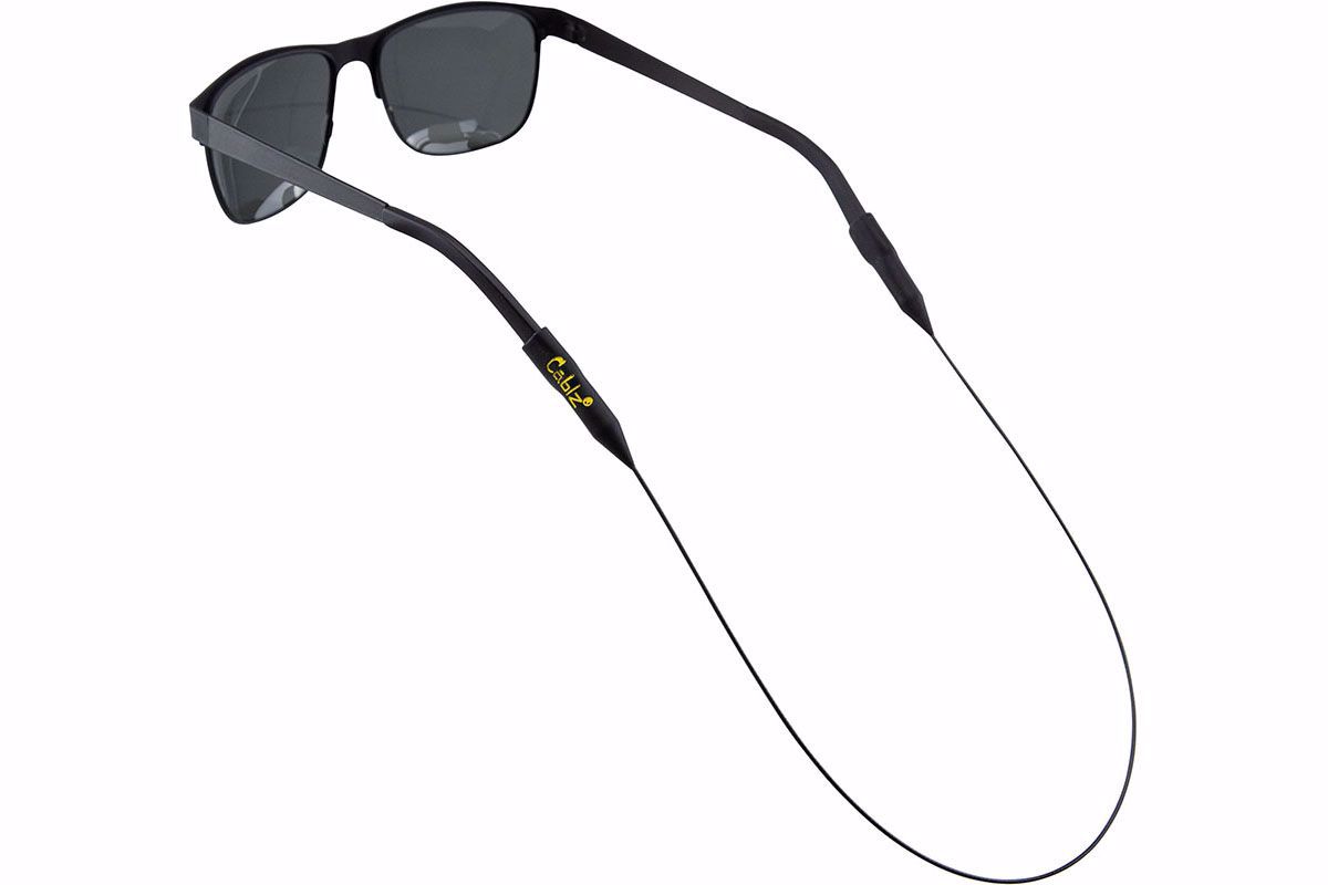 NON-ADJUSTABLE black coated stainless cable Our standard “universal” size temple end is very “stretchy” and should fit most frames.