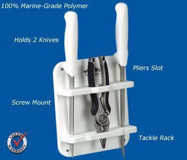 This economically priced knife/pliers/rig holder is designed to hold 2 knives, pliers, and many hooks, lures, and rigs. Constructed of 100% marine-grade polymer and includes 4 stainless steel mounting screws. Measures 7" wide x 8" tall. Lifetime Warranty.