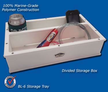 Divide into two compartments; 13 1/2" x 4 1/4" x 2 1/2" deep and 13 1/2" x 2 3/4" x 2 1/2" deep. Overall size is 8" x 14" x 2 1/2". Fits drinks, phones, cameras, sun screen, tackle, etc. Includes suction cups.