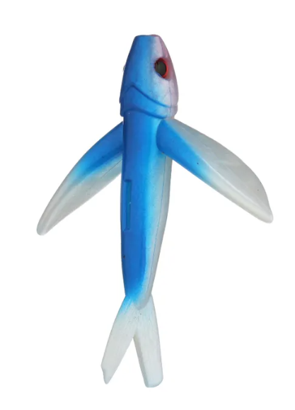 One piece, soft plastic flying fish that can be used as a trolling lure, kite bait or as a teaser bait. Our flying fish are designed with a large rigging channel in the bottom. The channel has a tunnel to the top for kite application, then front to back for trolling. High quality paint that stays on despite fish explosions and our eyes stand the test of time. These flying fish are durable while still being soft enough to look and feel realistic.
