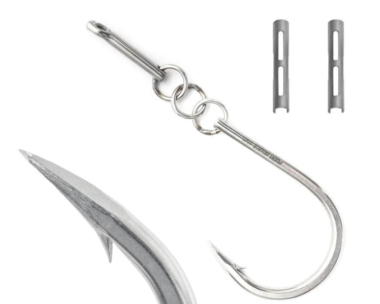 Using a system of sleeves and welded rings, the Sta-Stuk hook remains intact on the initial bite, separating only at a specific amount of pressure. By reducing the length of the shank, the design reduces the amount of rotational torque created during the fight and lowering the amount of pulled and thrown hooks.