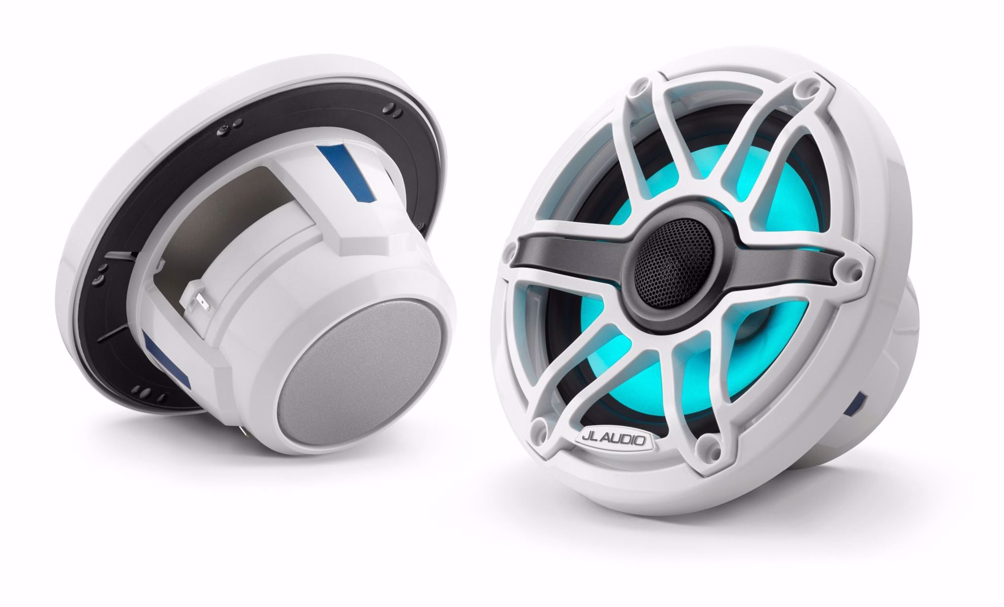 M6 6.5-inch Marine Coaxial Speakers with Transflective™ LED Lighting (75 W, 4 Ω) - Gloss White Trim Ring, Gloss White Sport Grille Purpose-engineered and built for real marine duty, M6 coaxial systems deliver maximum audio performance in any open-air boating environment, with the added visual impact of JL Audio’s Transflective™ RGB LED lighting. A DMA-optimized, long excursion woofer design and excellent power handling ensures your music will come through loud and clear at speed, or at anchor. A 0.8-inch pure silk dome tweeter, specially treated to withstand the marine environment, handles the high-frequency duties. You will appreciate the clean, articulate high-frequency response of the M6 dome tweeter, especially at higher volume levels. A multi-order, true 2-way passive crossover is concealed within the woofer chassis, shielded from vibration and corrosion. Also included, is an automatic, solid-state tweeter protection circuit to minimize the possibility of tweeter failure. Although M6-650-X Coaxial Systems can be used with as little as 25 W per channel, for best audio performance we recommend amplifiers capable of between 75-150 W of continuous power per channel. The patent-pending Transflective™ RGB LED technology emits a smooth lighting effect through the woofer cone, with a choice of several lighting colors. Add an optional RGB controller to create thousands of color variations. Production of all M6 loudspeakers takes place in JL Audio’s Miramar, Florida factory, using global components and materials. Sold as a pair.