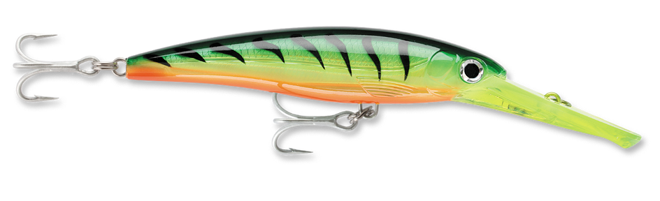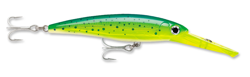 X-Rap® Magnums® run perfect right out of the box, no wasted time tuning. The massive diving-lip takes the X-Rap® Magnums deep… unassisted. Nothing to hinder the action. Each dive to its preset depth…the XRMag10 to 10 feet, the XRM15 to 15 feet, etc. Run up to 13 knots for big game fish worldwide. Big water patterns compliment the X-Rap construction standards – textured translucent body, internal holographic foil, 3D holographic eyes. Built saltwater tough with 3X split rings holding 4X VMC® Perma Steel hooks. Some models feature colored lip for added attraction.