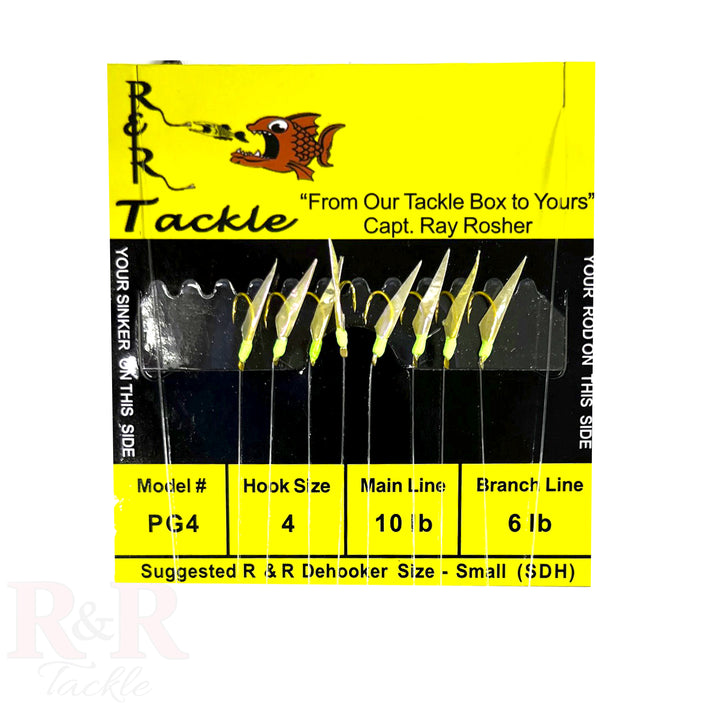 Maximize your bait-catching success with the R&R Tackle PG Monofilament Bait Rig, trusted by anglers for its reliable performance, natural presentation, and premium components. Designed for targeting Pilchards, Herring, Sardines, Cigar Minnows, and other small baitfish, this rig is ideal for both inshore and offshore live bait fishing. Each PG bait rig features 8 ultra-sharp stainless steel hooks with green glow heads and lifelike fish skin, providing realistic flash and irresistible movement that draws baitfish in. Available in hook sizes 4, 5, 6, 7, or 8, you can match the size to your target species and fishing conditions. Crafted with a strong 10lb monofilament main line and 6lb branch lines, this rig offers the perfect balance of stealth and strength. Whether you're fishing in clear water or under pressure, the PG Series delivers professional-grade results.