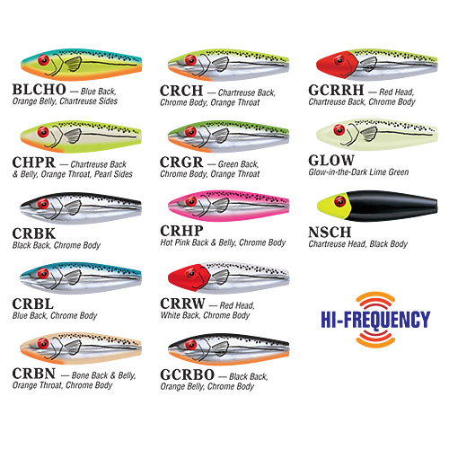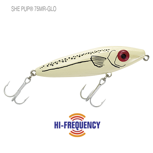 Molded from "space age" plastic the She Pup® features twin "sonic fish calling" rattles. Each emits a high frequency sound which enrages game fish into monstrous strikes. High buoyancy allows great "walk-the-dog action" which anyone can master.