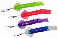 Squidnation Single Rigged Dredge Squids are intended to be put on a dredge just like a mullet or mud flap. Simply snap it on the bar with the 250lb marlin snap swivel. These proven squids come in a variety of electric colors. They are constructed using 250lb mono line. 1.6mm aluminum swivel sleeves, a 1 oz egg sinker and 250lb coast lock Marlin snap swivel.