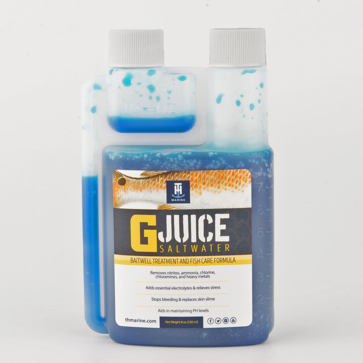 G-Juice is not only a convenient liquid, but also a single phase, full-function water conditioner for use in freshwater and saltwater. G-Juice should be used when conditioning water entering the livewell, bait tanks, minnow buckets, and in fish transport situations