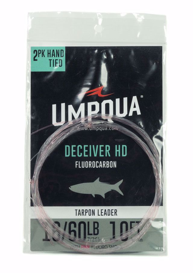 Umpqua’s Tarpon leader combines ultra-deceptive pink fluorocarbon shock tippet securely attached (Bimini/Hufnagel) to a strongly tapered clear nylon Perform X HD leader. Simply loop the leader to the fly line and tie on a fly. A heavy butt and strong knotless taper improves turnover in the wind, world-class tippet protects gear and fish, and the unique pink fluorocarbon shock-tippet deceives leader-shy fish while protecting the tippet.